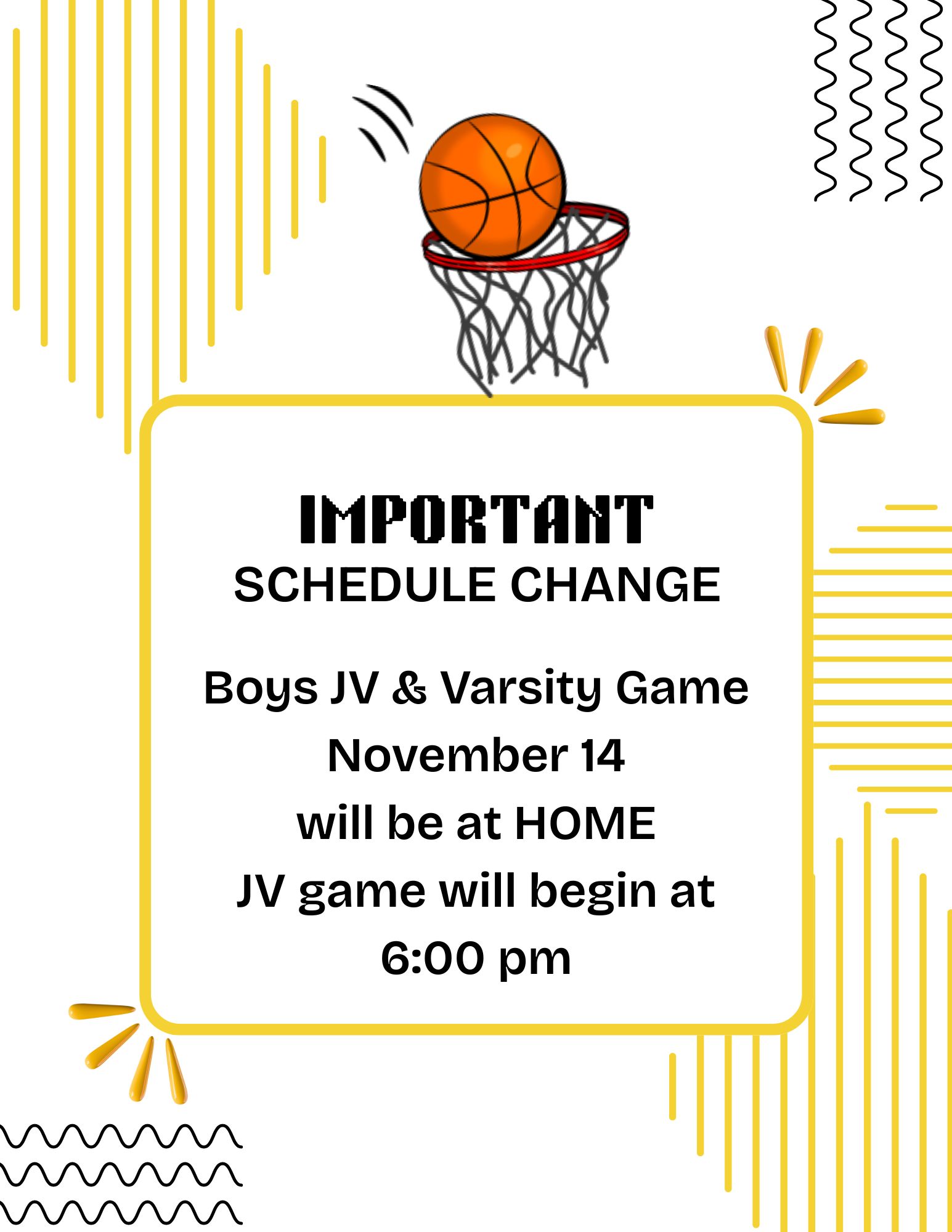 Boys JV & Varsity Basketball Games Nov. 14 Will be at HOME