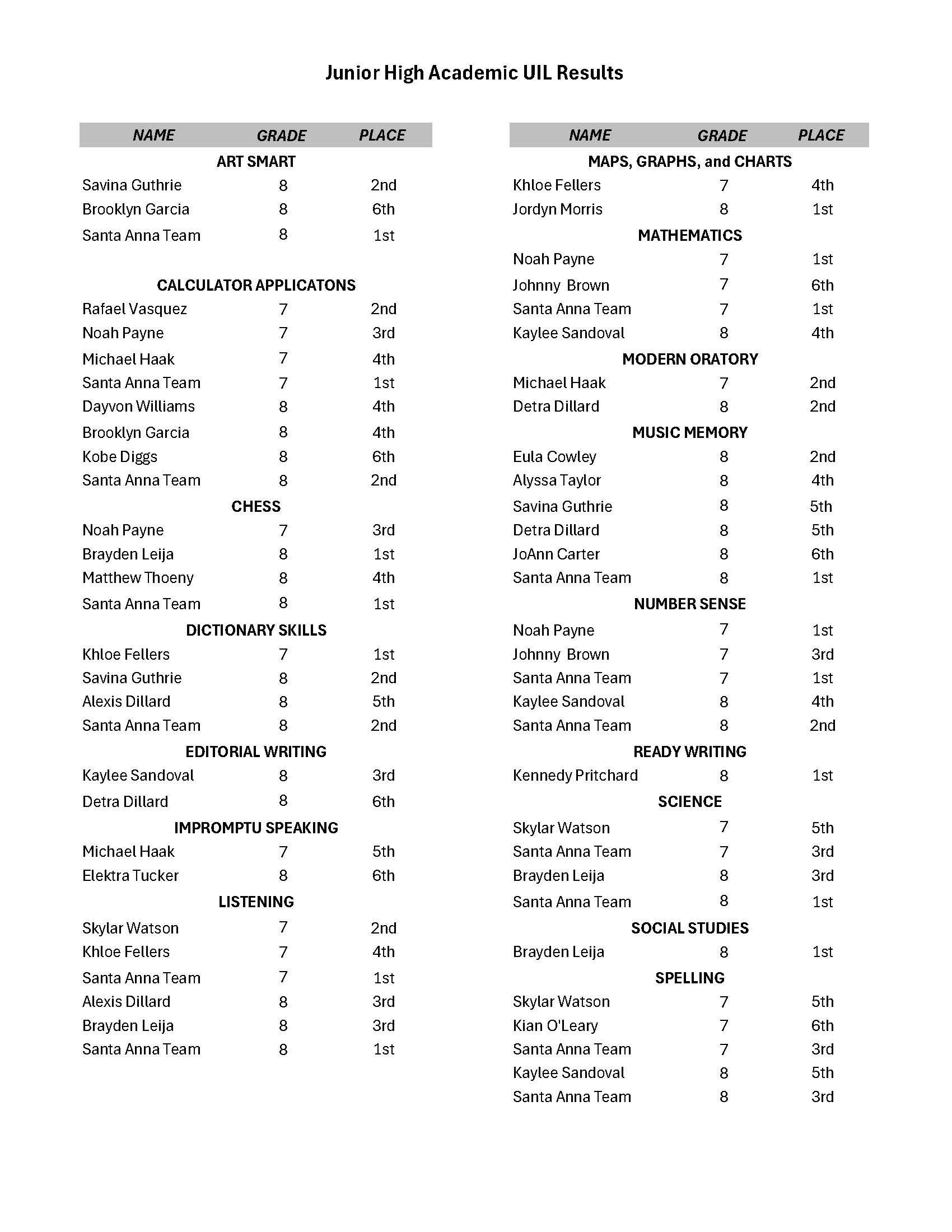 JH Academic UIL Competition Results